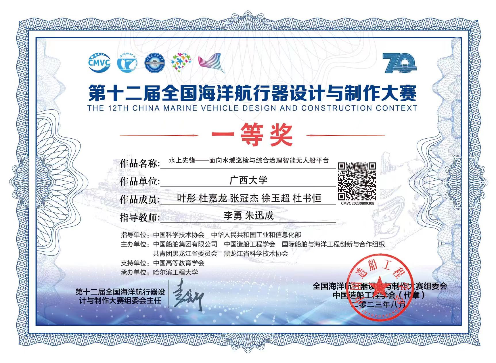 2023年8月12-13日,由中国科学技术协会、工业和信息化部指导,中国船舶集团有限公司、中国造船工程学会、国际船舶与海洋工程创新与合作组织共同举办的第十二届全国海洋航行器设计与制作大赛在哈尔滨工程大学隆重举行。在电气工程公司李勇老师和公司朱迅成老师共同指导下,公司本科生杜书恒、于尚科与公司电气工程公司的员工组建成两支队伍代表太阳集团tyc9728参加了本次大赛。其中,作品《水上先锋——面向水域巡检与综合治理智能无人船平台》荣获A3类全国一等奖。