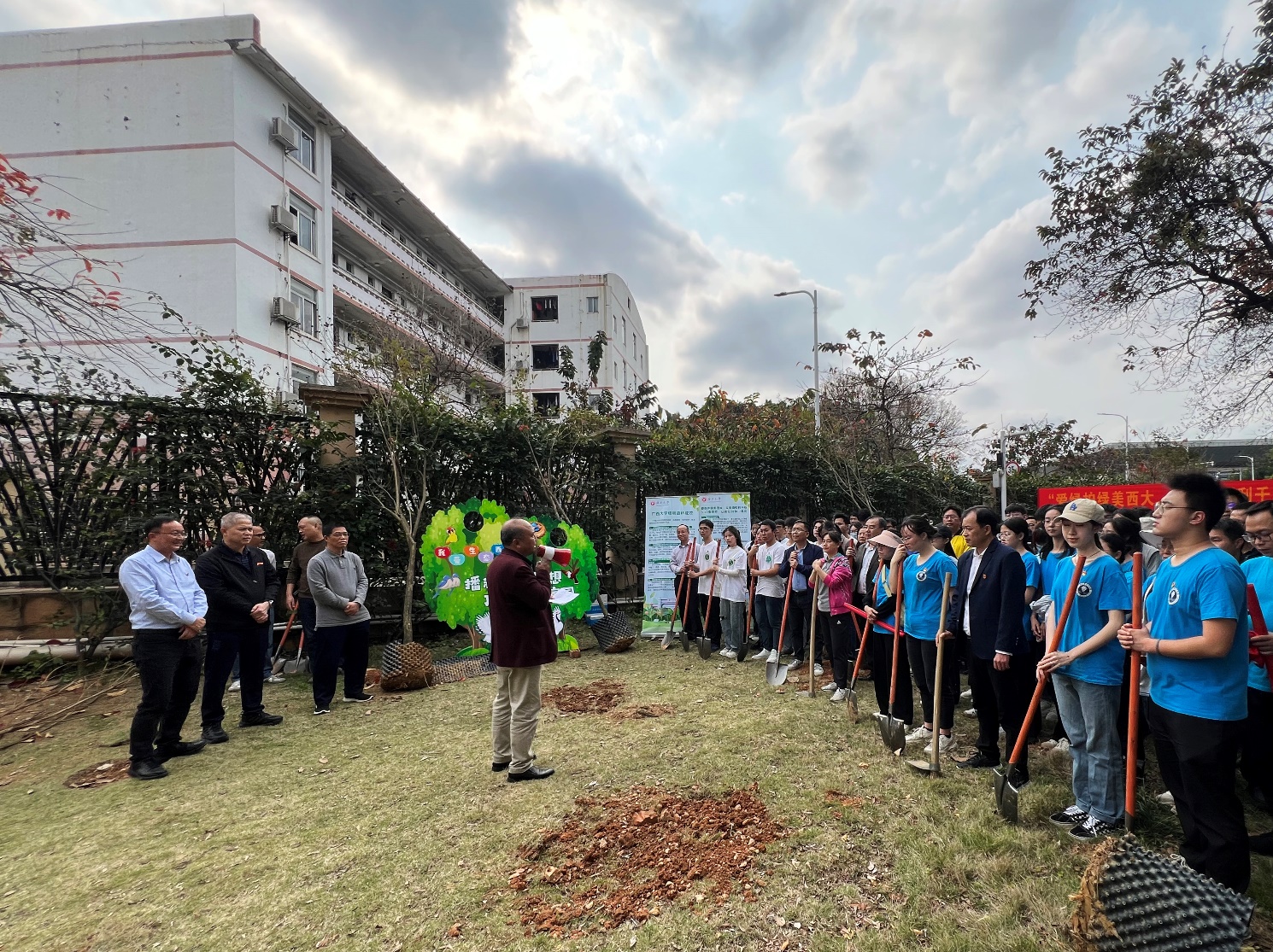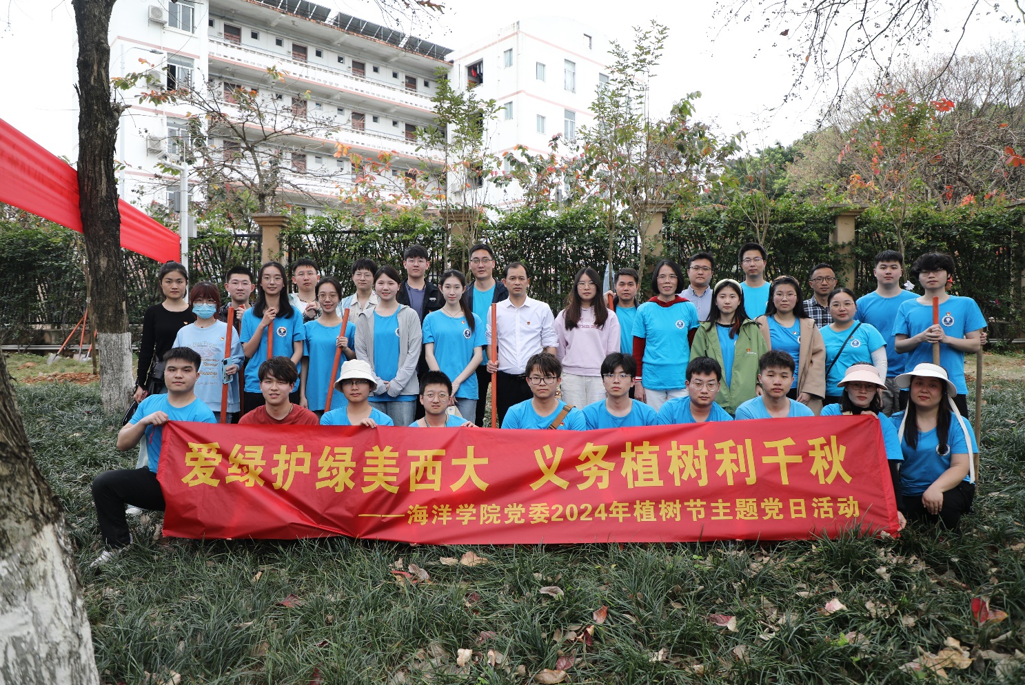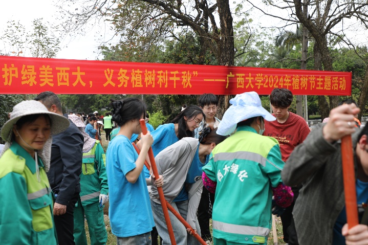 2024年3月12日是第46届国际植树节,为深入贯彻党的二十大精神,践行绿水青山就是金山银山的生态文明建设理念,弘扬植绿、护绿、爱绿的文明新风,加快推进绿色美丽校园建设,公司党委于2024年3月12日联合公司后勤基建处、资源环境与材料工程公司、广西博世科环保科技股份有限公司在公司图书馆西侧绿地开展主题为“爱绿护绿美西大,义务植树利千秋”2024年植树节主题党日活动。此次活动由公司后勤基建处处长余波主持,公司党委常委、副董事长宁旭初、刘向参加活动,公司党委书记秦华东率领师生党员共45人参与了活动。