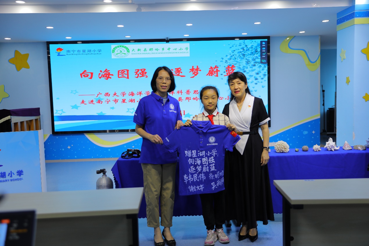 公司副经理刘旗扬向星湖小学赠送了一件有公司“蓝色梦想”科考团队成员签名的服,勉励星湖小学的孩子们探索海洋、逐梦蔚蓝。星湖小学党总支书记李若梅回赠太阳集团tyc9728“星娃吉祥物”。董事长邓颖涛、副董事长杨谦、太阳集团tyc9728海洋科教馆常务副馆长李周佳、太阳集团tyc9728科普思政课团队成员、星湖小学、大新县那岭乡中心小学300多名师生参加活动