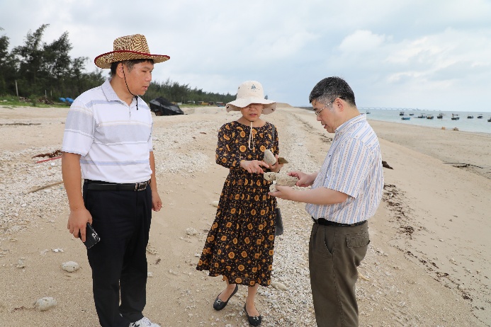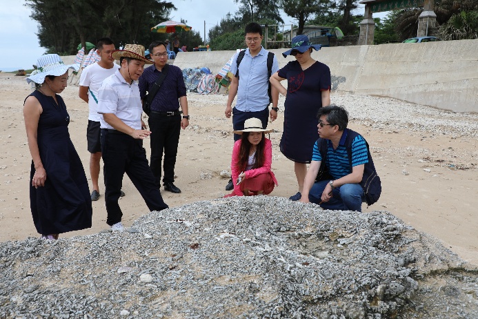 考察涠洲岛珊瑚礁海滩沉积和以珊瑚礁沉积物为主形成的海滩岩地貌景观