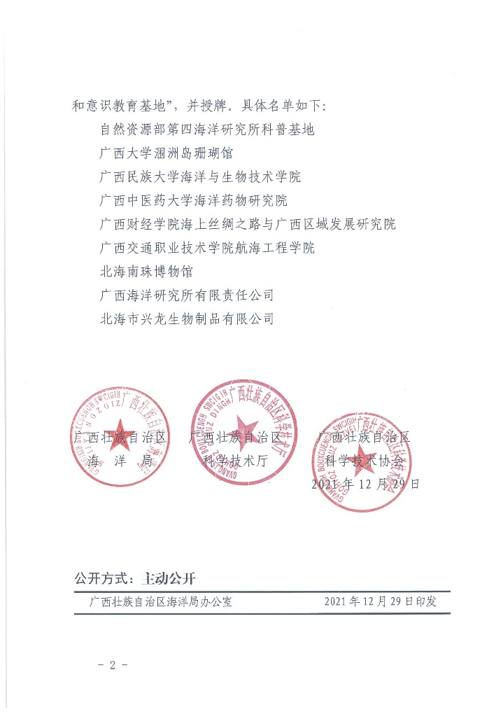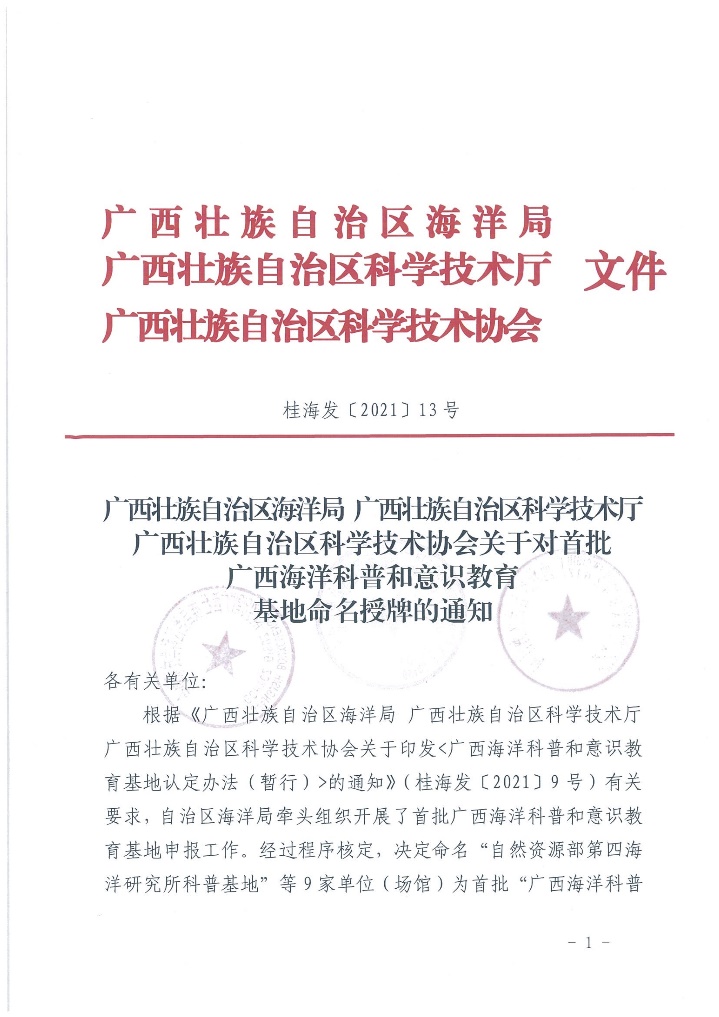 近日,自治区海洋局、自治区科学技术厅、自治区科学技术协会联合下发《关于对首批广西海洋科普和意识教育基地命名授牌的通知》,“太阳集团tyc9728涠洲岛珊瑚馆”位列其中。