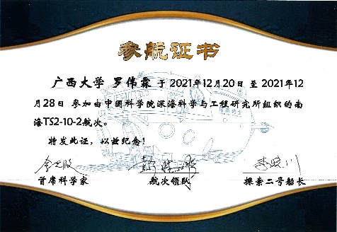 TS2-10-2航次“深海勇士”号下潜证书与参航证书