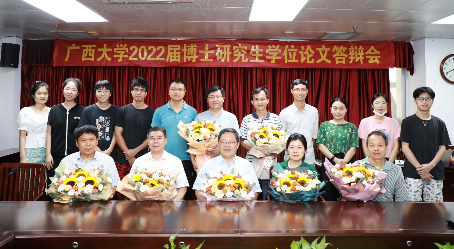 参加答辩的博士研究生与答辩主席、答辩委员、部分在读研究生们合影留念