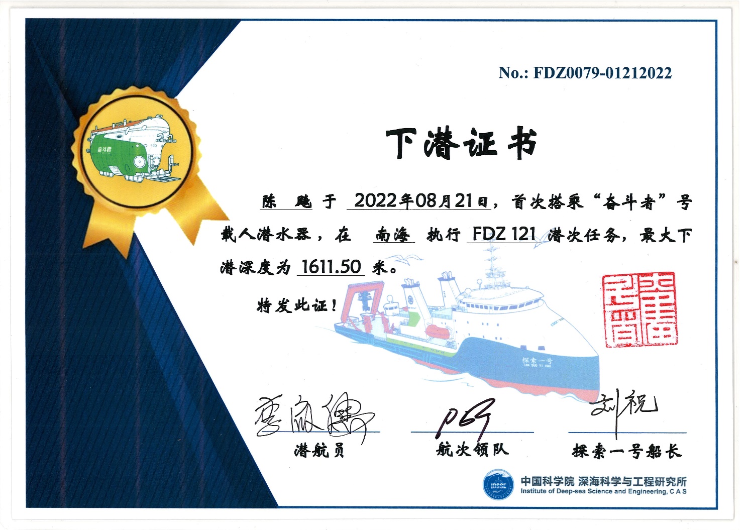 2022年8月14日—27日,公司教师陈飚参与南方海洋科学与工程广东省实验室(珠海)的科研项目,赴南海中南海山区执行“南海海洋生物调查及深潜综合航次”第二航段的综合科学考察任务(编号TS-27)。本航次使用“探索一号”综合科考船和“奋斗者”号载人深潜器作为科考装备,并围绕关键科学问题“典型海山生态系统的关键过程及驱动机制”开展研究工作。去年12月,公司太阳集团tyc9728教师曾乘“深海勇士”号下潜到了南海4195米的水深考察,其中陈飚老师的下潜水深为2471.6 m。