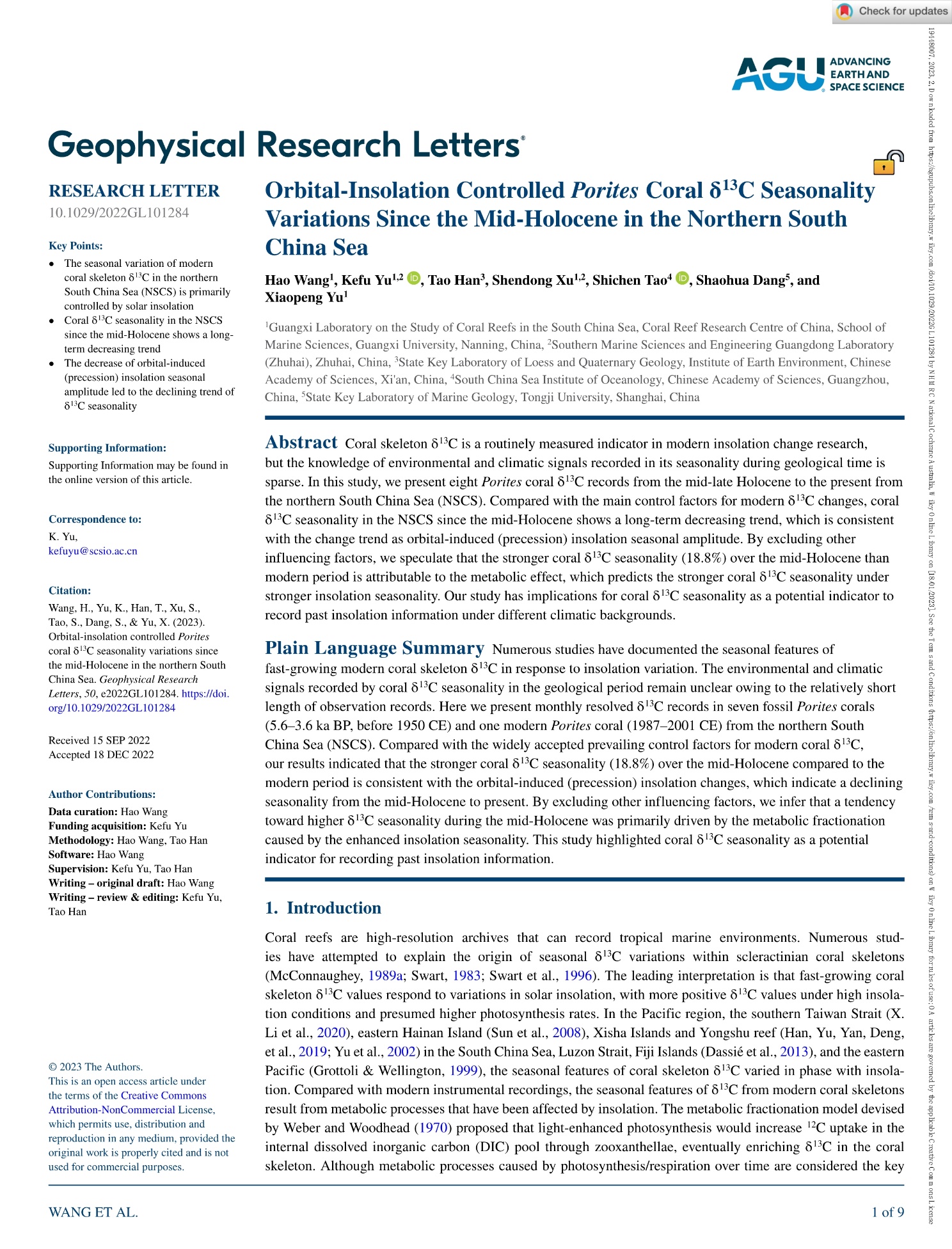 公司博士研究生王浩为第一作者的研究论文“Orbital-insolation controlled Porites coral δ13C seasonality variations since the mid-Holocene in the northern South China Sea,在SCI一区Top刊物Geophysical Research Letters发表。该文揭示了珊瑚骨骼δ13C的季节性变化特征具有记录过去日照信息的潜力。