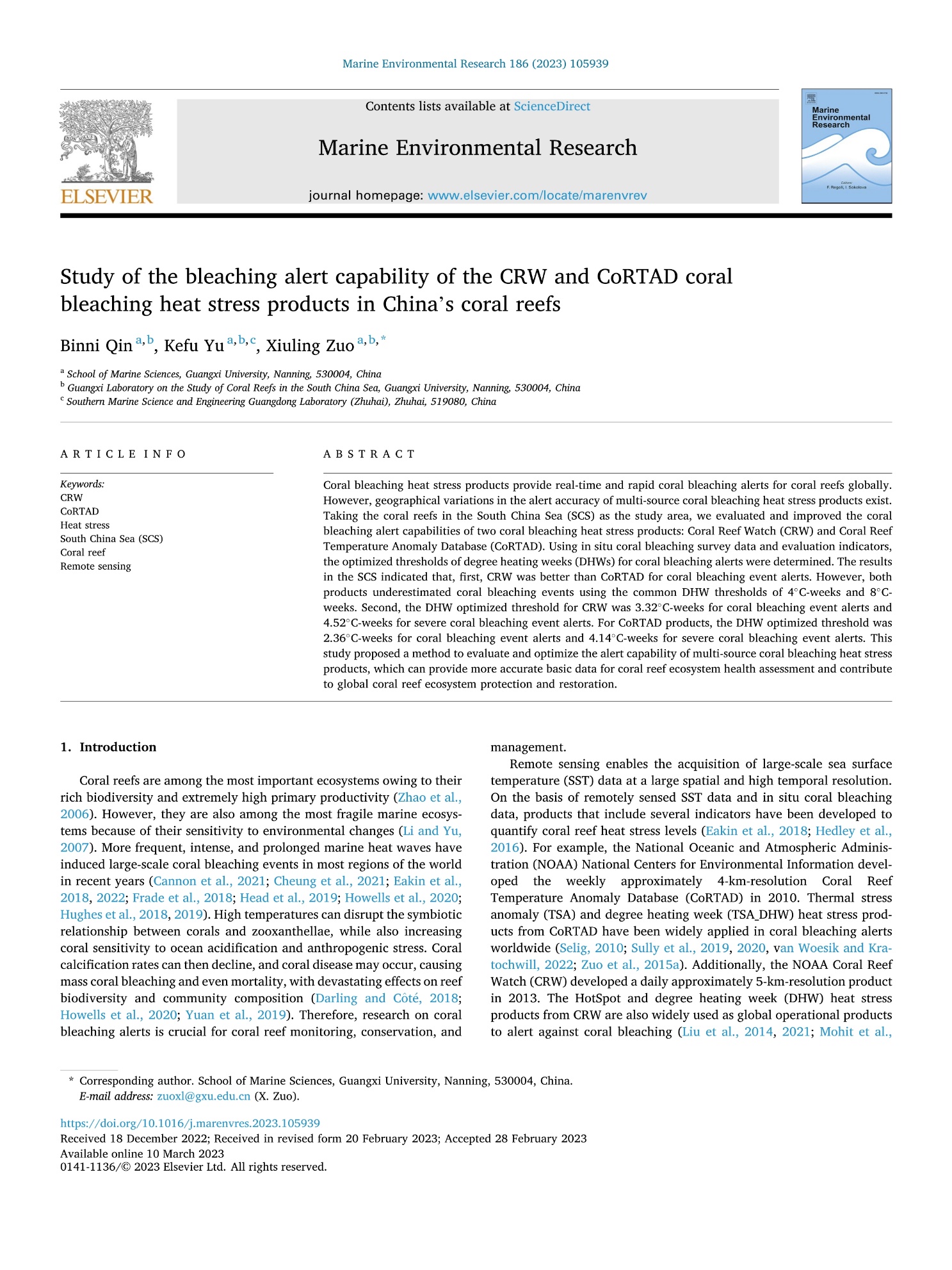 Qin Binni, Yu Kefu, Zuo Xiuling. Study of the bleaching alert capability of the CRW and CoRTAD coral bleaching heat stress products in China’s coral reefs. Marine Environmental Research, 2023, 186, 105939. https://doi.org/10.1016/j.marenvres.2023.105939.
