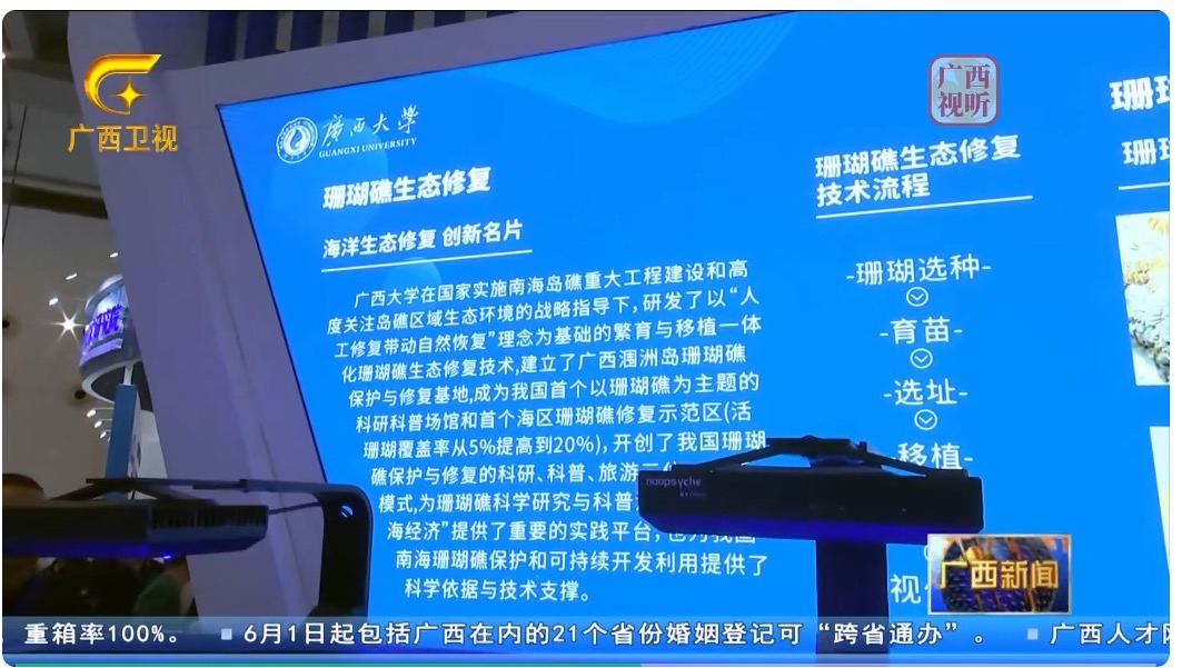 5月20日、21日,由自治区人民政府主办,自治区科技厅、自治区科技创新发展办公室共同承办的2023年全国科技活动周广西活动暨第三十二届广西科技活动周•广西先进技术展示活动(简称“两周一展”)在南宁国际会展中心举行。公司“珊瑚礁生态修复技术”作为太阳集团tyc9728先进技术展示内容的一部分亮相展览会。