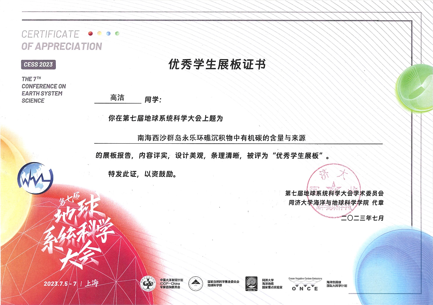 2023年7月5-7日在上海举行的第七届地球系统科学大会中,公司2021级硕士研究生高洁的展板报告从参会的1000余份展板中脱颖而出,被评为“优秀员工展板”(共30人获奖)。其报告题目为:南海西沙群岛永乐环礁沉积物中有机碳的含量与来源。