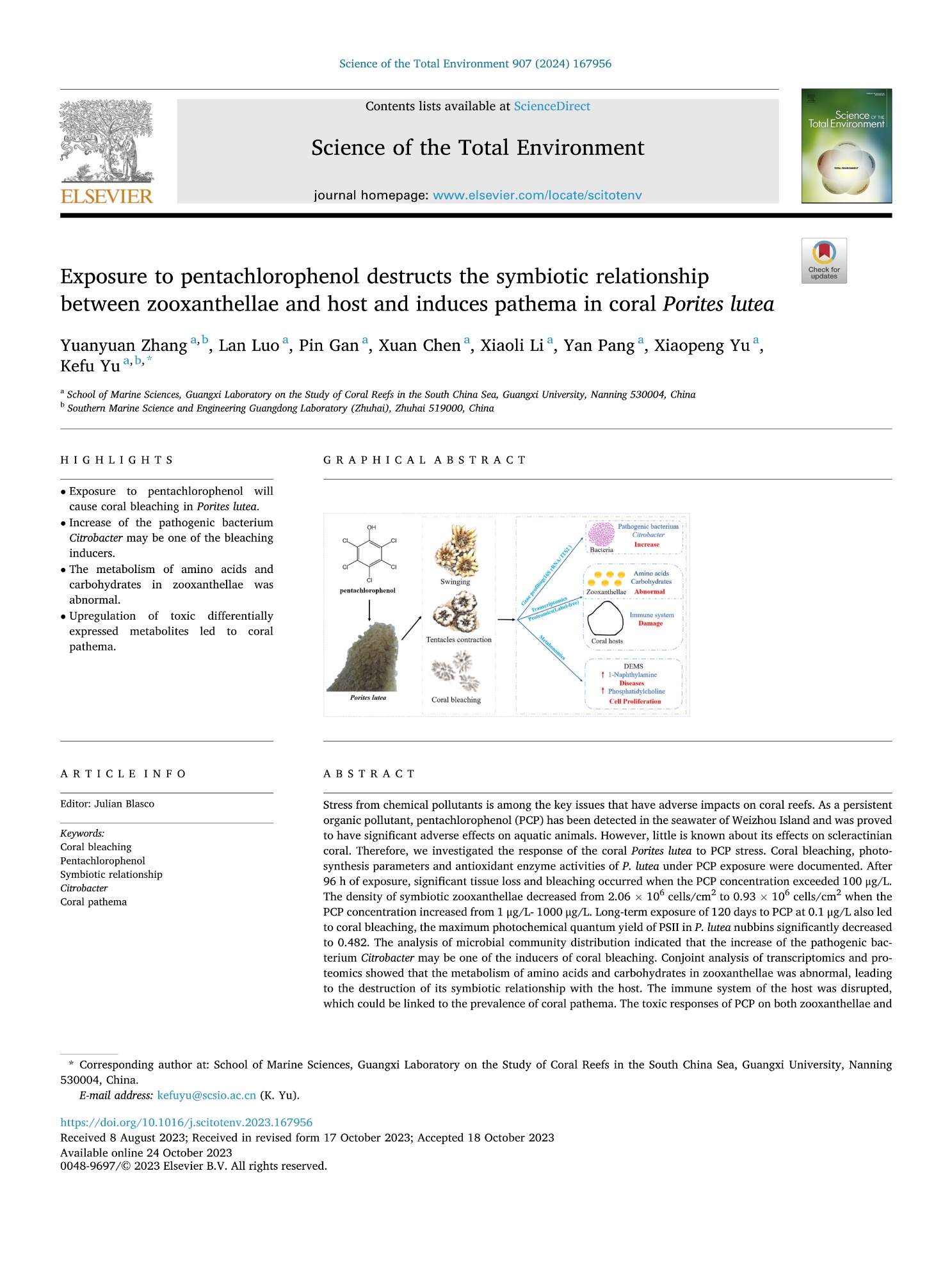 张媛媛副教授等在STOTEN上发表五氯苯酚(PCP)对珊瑚共生关系影响的研究成果