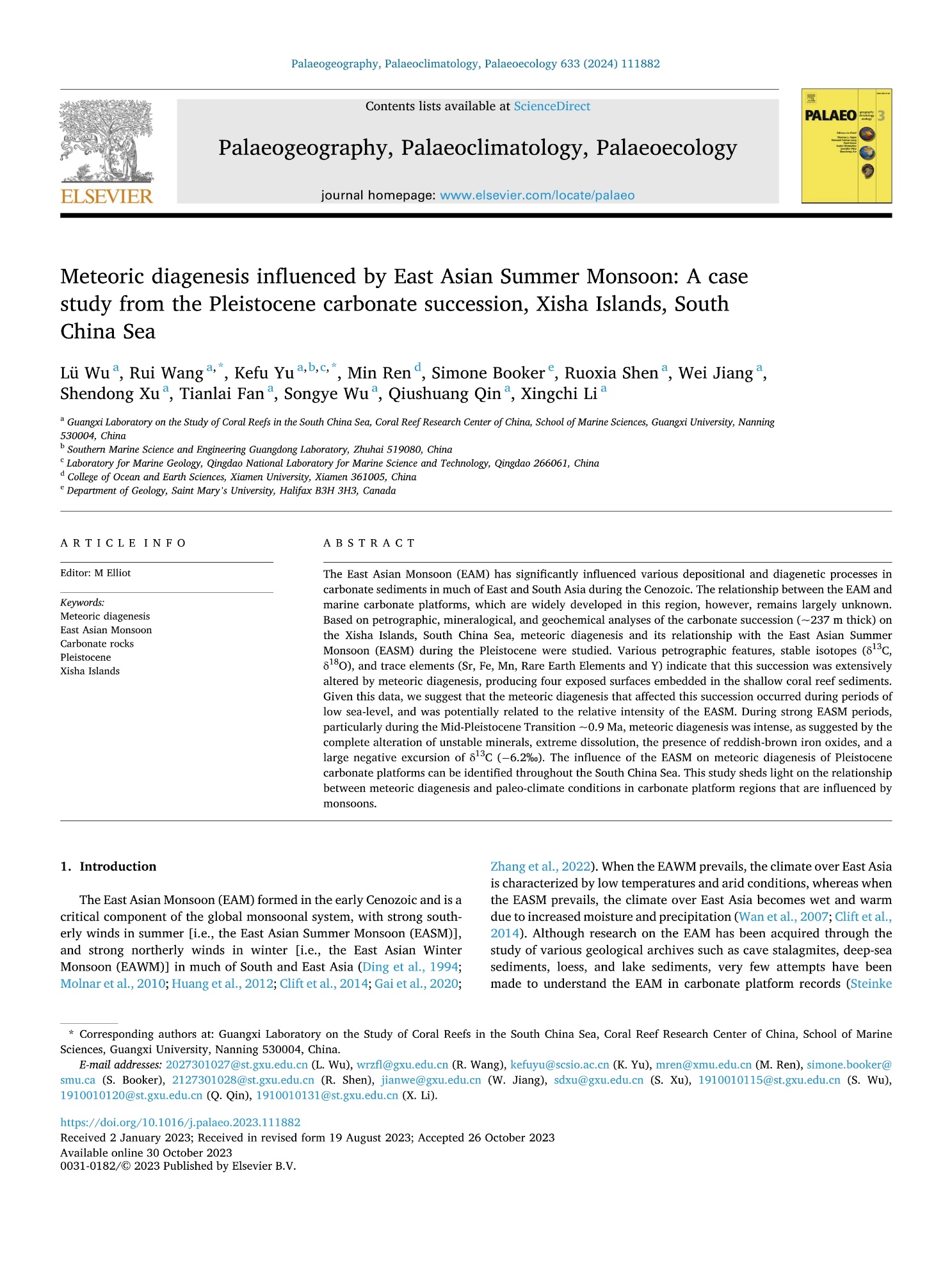 东亚季风(EAM)形成于新生代早期,是全球季风系统的一个重要组成部分。尽管人们通过对洞穴石笋、深海沉积物、黄土和湖泊沉积物等多种地质档案的研究在一定程度上获取了EAM的信息,然而,EAM与该地区广泛发育的珊瑚礁沉积之间的联系仍不清楚。该论文通过对南海西沙群岛琛科2井更新世厚~237 m珊瑚礁灰岩的岩石学、矿物学和地球化学13Cδ18OSrFeMnΣREE + Y)分析,研究了更新世大气淡水成岩作用及其与东亚季风(EAM)的联系。