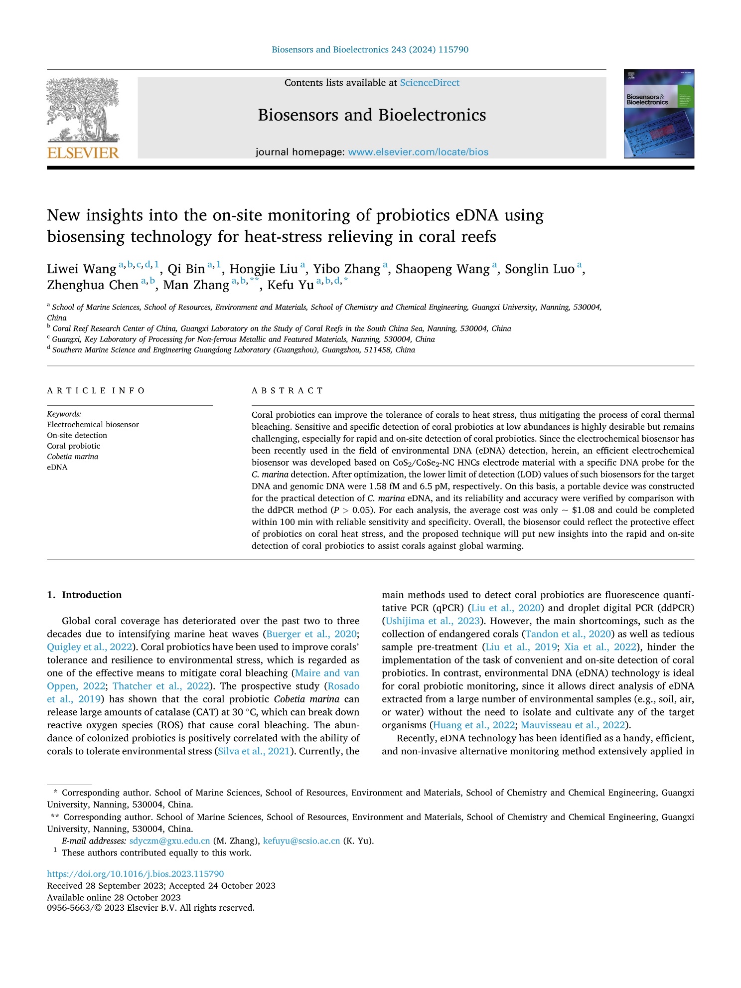 近日,公司副教授王丽伟及其指导的硕士研究生宾琪等在中国科公司一区Top期刊Biosensors and Bioelectronics发表了题为“New insights into the on-site monitoring of probiotics eDNA using biosensing technology for heat-stress relieving in coral reefs”的研究论文。