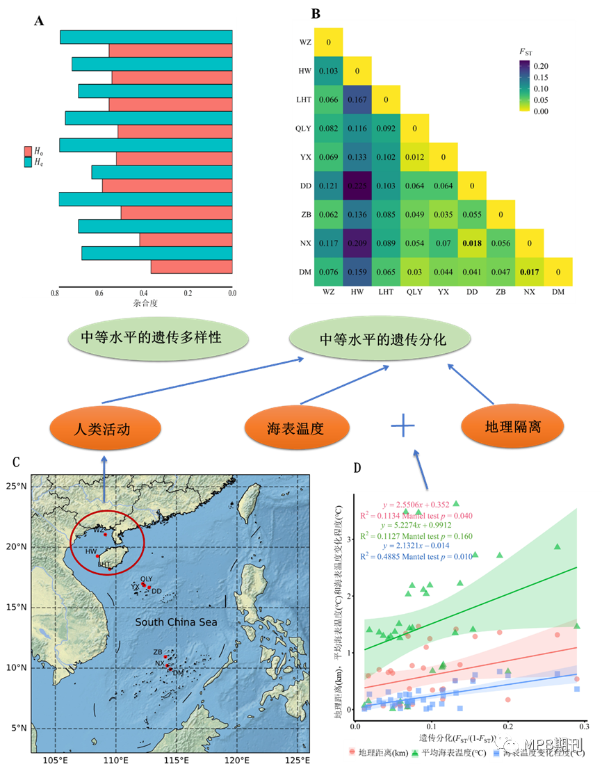 研究团队于2018-2021年间在南海9个站位(跨越12个纬度)采集了146个丛生盔形珊瑚样本,室内使用8对微卫星标记表征了其遗传多样性和遗传结构。遗传多样性结果显示,南海丛生盔形珊瑚遗传多样性为中等水平,各站位之间差异较小。AMOVAFST成对分析结果显示,南海丛生盔形珊瑚群体之间存在中等水平的遗传分化,群体之间的基因交流不充分。Mantel test结果表明,南海丛生盔形珊瑚群体间的遗传分化与海表温度变化程度、空间距离存在显著的正相关关系,表明海表温度和空间距离是影响南海丛生盔形珊瑚遗传分化的重要因素,其中海表温度的影响更大。但相对高纬度的珊瑚群体(涠洲岛、海尾湾、鹿回头)之间遗传分化程度较高,可能是受人类活动所致。