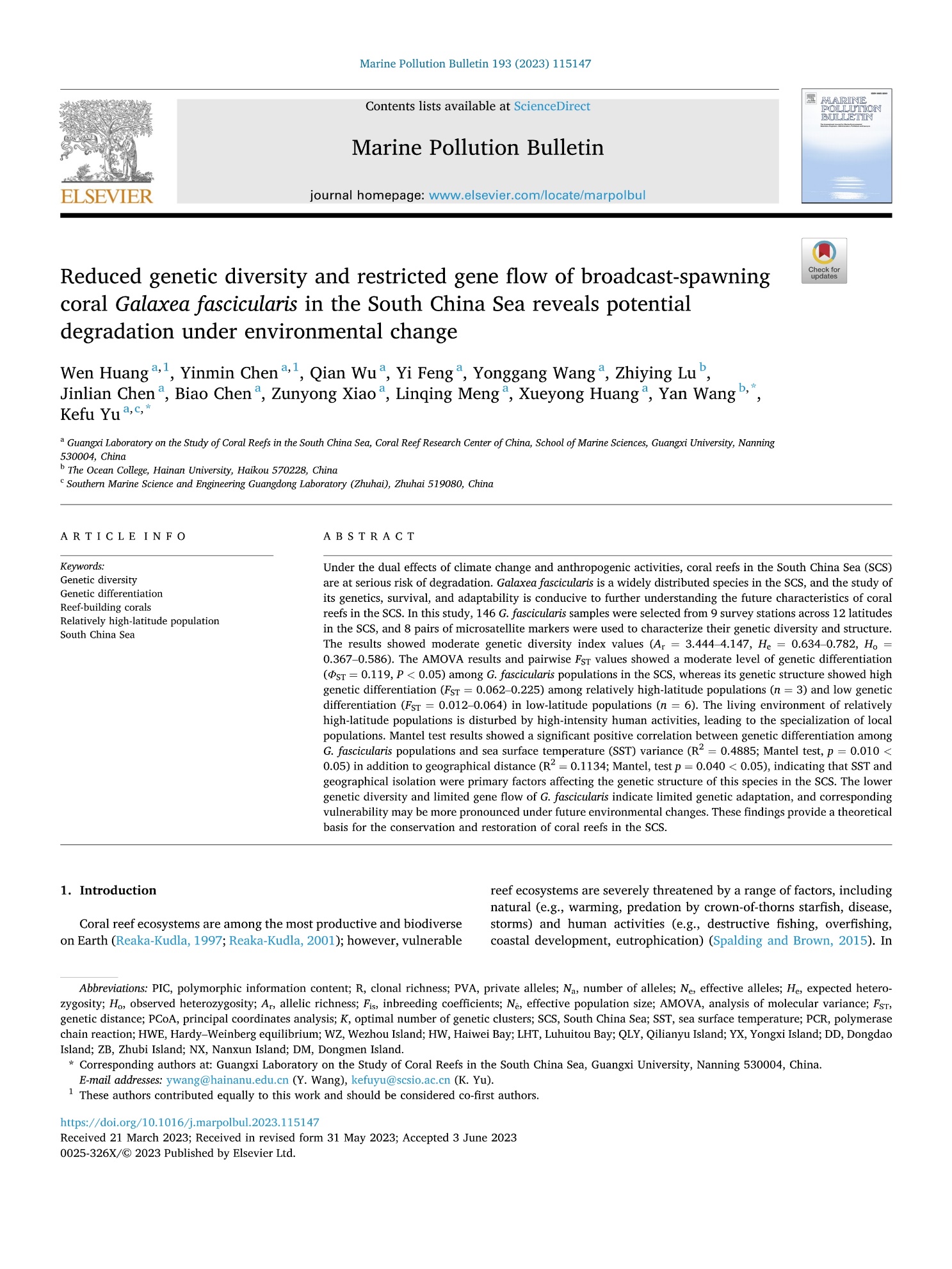 Huang Wen, Chen Yinmin, Wu Qian, Feng Yi, Wang Yonggang, Lu Zhiying, Chen Jinlian, Chen Biao, Xiao Zunyong, Meng Linqing, Huang Xueyong, Wang Yan, Yu Kefu. (2023). Reduced genetic diversity and restricted gene flow of broadcast-spawning coral Galaxea fascicularis in the South China Sea reveals potential degradation under environmental change. Marine pollution bulletin 193, 115147-115147. https://doi.org/10.1016/j.marpolbul.2023.115147.