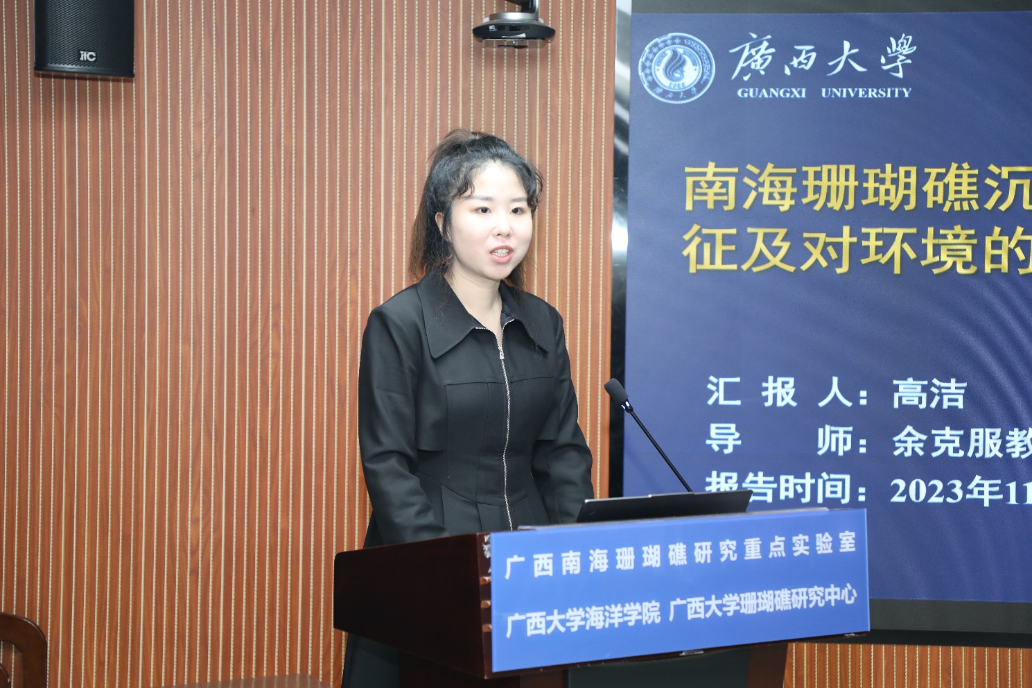 包锐教授还与公司师生进行座谈交流。余克服经理、广西南海珊瑚礁研究重点实验室常务副主任黄荣永相继介绍太阳集团tyc9728、广西南海珊瑚礁研究重点实验室的综合建设情况。交流会中,海洋科学2021级硕士研究生高洁以“南海珊瑚礁区沉积物中有机碳的埋藏特征及对环境的指示意义”为题,从研究背景、拟解决的科学问题、目前初步结果等方面详细介绍了珊瑚礁沉积有机碳在碳循环中的重要作用。包锐教授结合他自己的求学和科研相关经历,为同学们分享了如何讲好科研故事、增加国际视野等宝贵经验。