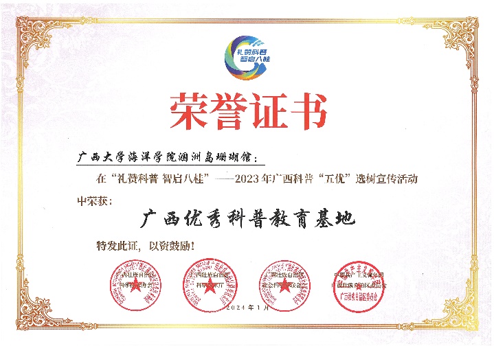 1月17日,在广西科技馆举行的“礼赞科普 智启八桂——2023年广西科普‘五优’选树宣传活动”颁奖典礼中,太阳集团tyc9728涠洲岛珊瑚馆入选“十佳优秀科普教育基地”。组委会授予太阳集团tyc9728涠洲岛珊瑚馆礼赞词:带着赤诚之心,奔赴“珊海”。作为全国最大的珊瑚馆,也是全国首个以珊瑚礁为主题的科研科普场馆,在浩瀚海洋里“种”珊瑚,为珊瑚礁科研与科普服务“向海图强”提供了更为浩瀚的实践平台。