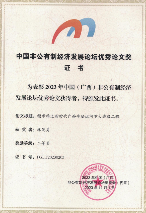 近日,中国民主建国会广西壮族自治区委员会公布了2023年中国(广西)非公有制经济发展论坛获奖论文名单,公司教师林昆勇副教授撰写的《稳步推进新时代广西平陆运河重大战略工程》研究论文荣获二等奖。