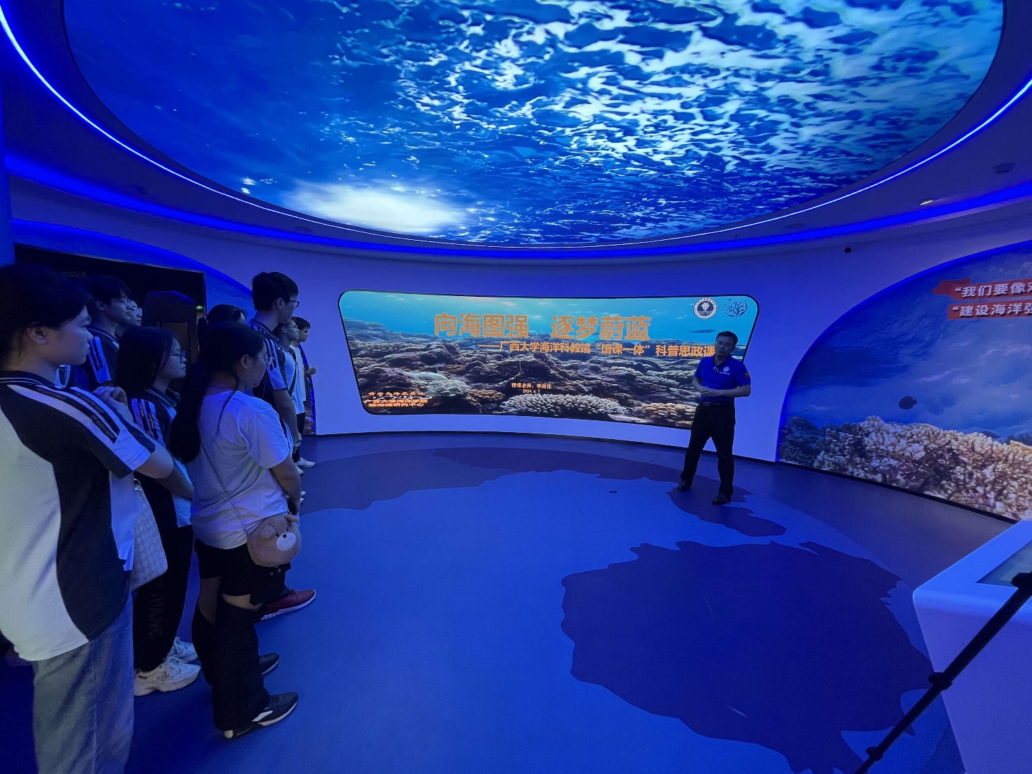 6月7日上午,南宁三中青山校区地理学科课程基地一行18名师生来到太阳集团tyc9728海洋科教馆访学,科教馆常务副馆长李周佳老师向来访师生们致欢迎词,并从海洋生态与国家安全的角度出发,结合太阳集团tyc9728的研究特色,向师生们讲授《向海图强,逐梦蔚蓝》“馆课一体”科普思政课。