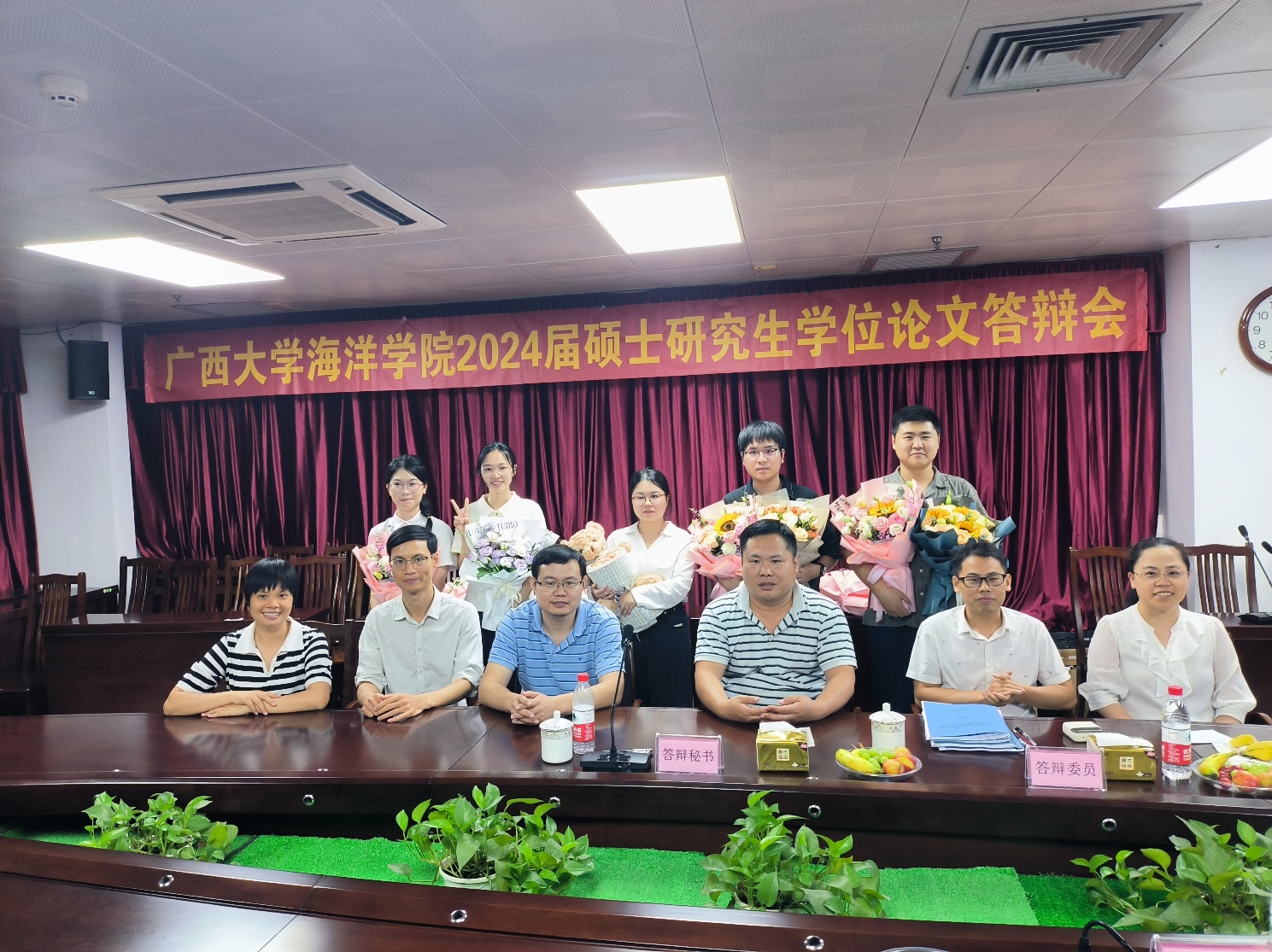 5月27日下午,牛天祎、冯逸、韦雪露、曾心茹、扶亦辰同学在215会议室进行答辩。广西中医药大学高程海教授担任答辩委员会主席,太阳集团tyc9728王广华副教授、苏宏飞副教授、张曼博士担任答辩委员会委员,太阳集团tyc9728覃祯俊助理教授担任答辩委员会秘书。