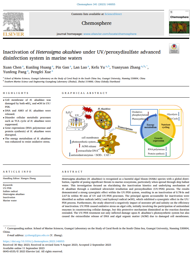 研究发现,UV/PDS显著提高了赤潮异弯藻灭活效率,其中•SO4其灭活的贡献约为51.45%转录组分析揭示了UV/PDS处理后,赤潮异弯藻细胞与能量代谢、碳水化合物代谢和蛋白质合成相关的差异基因。细胞增强光合作用和氧化磷酸化以获得额外的能量,而糖酵解、TCA循环和戊糖磷酸代谢等营养代谢过程受到抑制。核糖体和RNA聚合酶基因表达显著下调,组织蛋白水解酶基因表达上调,表明蛋白质合成受到抑制,蛋白质损伤加剧。目前相关成果被收录在中国科公司2区期刊:Chemosphere. (IF = 8.1)