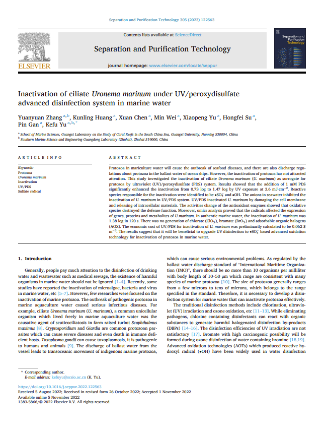结果表明,UV/PDS系统对海洋尾丝虫具有极强的灭活效果,系统中产生的自由基破坏了海洋尾丝虫细胞完整性和酶活性,且影响了基因、蛋白质的表达以及代谢产物。研究还发现,添加碳源会抑制ClO3BrO3无机消毒副产物的产生。该技术为绿色高效海水养殖水体消毒技术的发展提供了新的思路。目前相关成果被收录在中国科公司1区期刊:Separation and Purification Technology. (IF = 8.1)