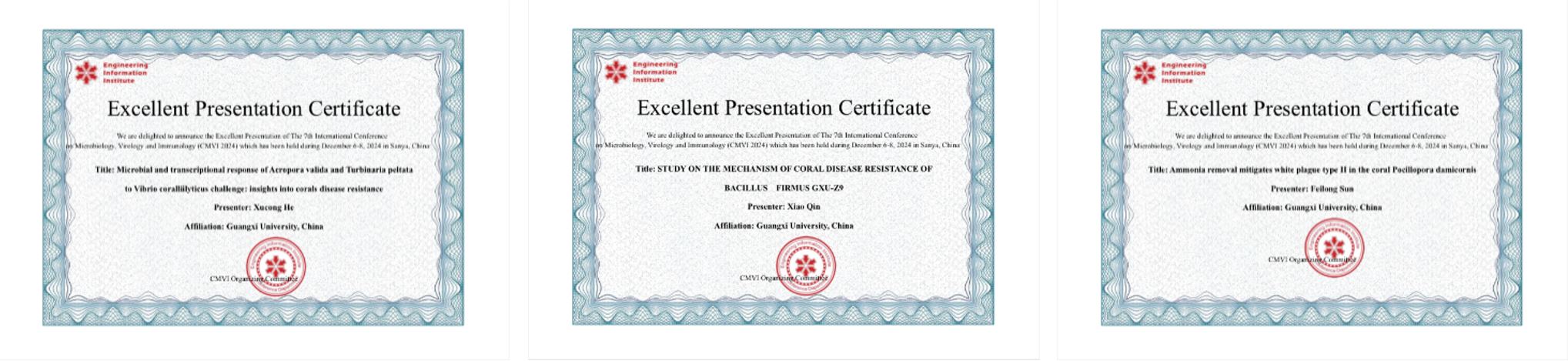 近日,公司苏宏飞副教授课题组的何旭聪、秦晓、孙非龙等3名硕士研究生获得“太阳集团tyc9728研究生倍增计划-研究生素质能力提升项目”资助,前往海南三亚参加了第七届微生物学、病毒学和免疫学国际学术会议(The 7th Int'l Conference on Microbiology, Virology and Immunology,简称CMVI 2024)。此次会议由新加坡工程信息研究院(Engineering Information Institute)主办,美国科研出版社协办,武汉帕萨科技服务有限公司承办。