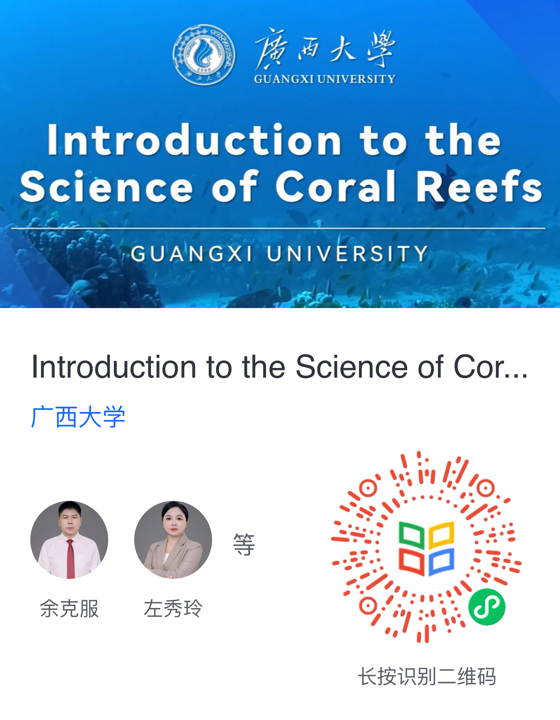 近日,由余克服教授领衔建设的《珊瑚礁科学概论》英文课程已正式在学堂在线国际版平台上线!左秀玲、陈飚、覃祯俊、张瑞杰、江蕾蕾、王瑞、姜伟、黄荣永、黄雯9位教师共同参与建设。珊瑚礁,被誉为“海洋中的热带雨林”、“蓝色沙漠中的绿洲”,是南海重要的生态资源和陆地国土。本课程的目的,是传播珊瑚礁的科学知识,提升对珊瑚礁的保护意识,服务国家的海洋强国战略。
