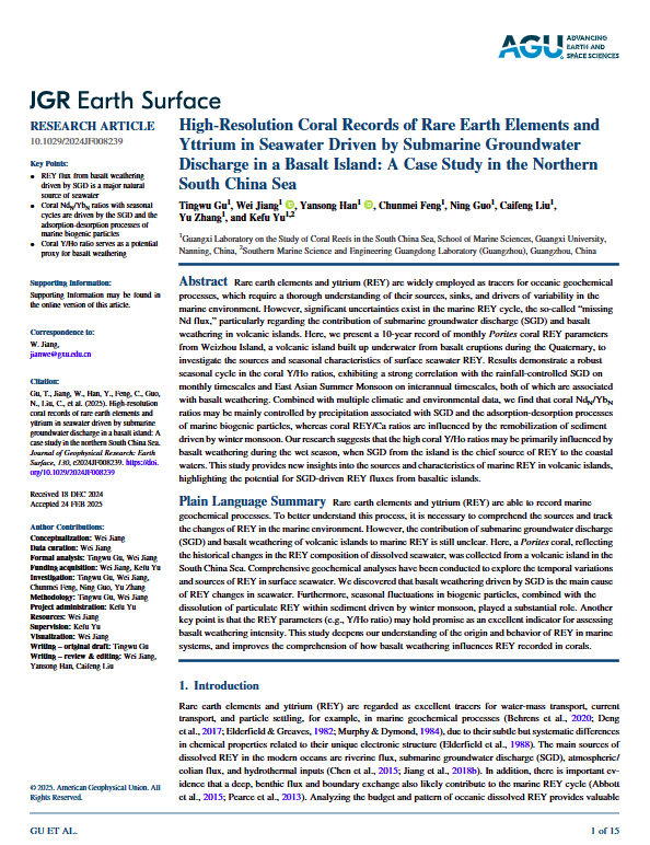 Gu T., Jiang W., Han Y., et al. (2025). High-resolution coral records of rare earth elements and yttrium in seawater driven by submarine groundwater discharge in a basalt island: A case study in the northern South China Sea, Journal of Geophysical Research: Earth Surface, 130: e2024JF008239. https://doi.org/10.1029/2024JF008239