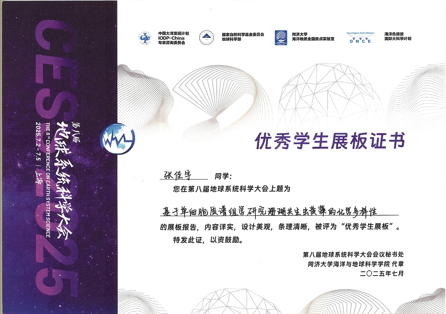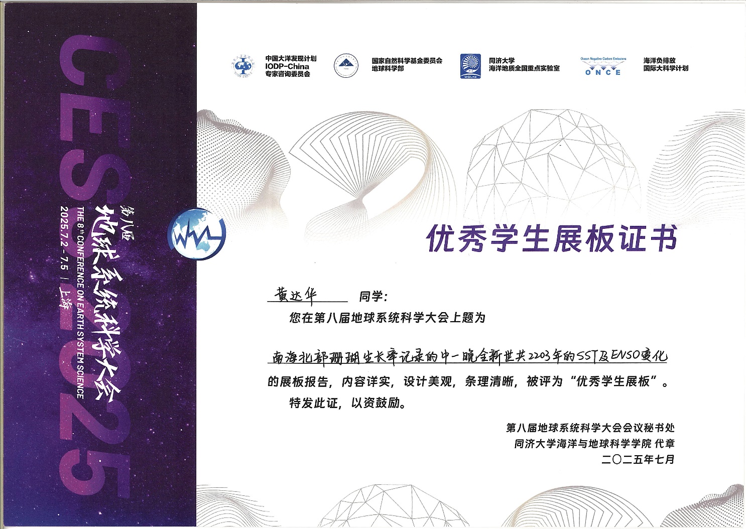 202572-5日在上海举行的第八届地球系统科学大会中,公司2023级硕士研究生黄达华、2022级本科生张佳宇的展板报告从参会的450个员工展板中脱颖而出,被评为“优秀员工展板”(共27人获奖)。其报告题目分别为:南海北部滨珊瑚生长率记录的中-晚全新世共2203年的SSTENSO变化(黄达华)基于单细胞代谢组学研究珊瑚共生虫黄藻的化学多样性(张佳宇)