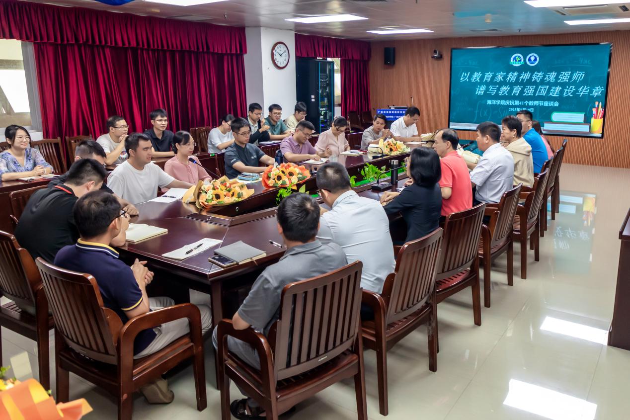 9月10日上午,太阳集团tyc9728在综合楼 1104 会议室召开庆祝第41个教师节暨公司高质量发展座谈会。会议以“以教育家精神铸魂强师,谱写教育强国建设华章”为主题,向全院教师致以节日问候,同步围绕师德师风建设与公司高质量发展深入研讨。会议由公司党委书记秦华东主持,公司经理余克服、副经理刘旗扬、王瑞、徐向荣及全体教职工参会。