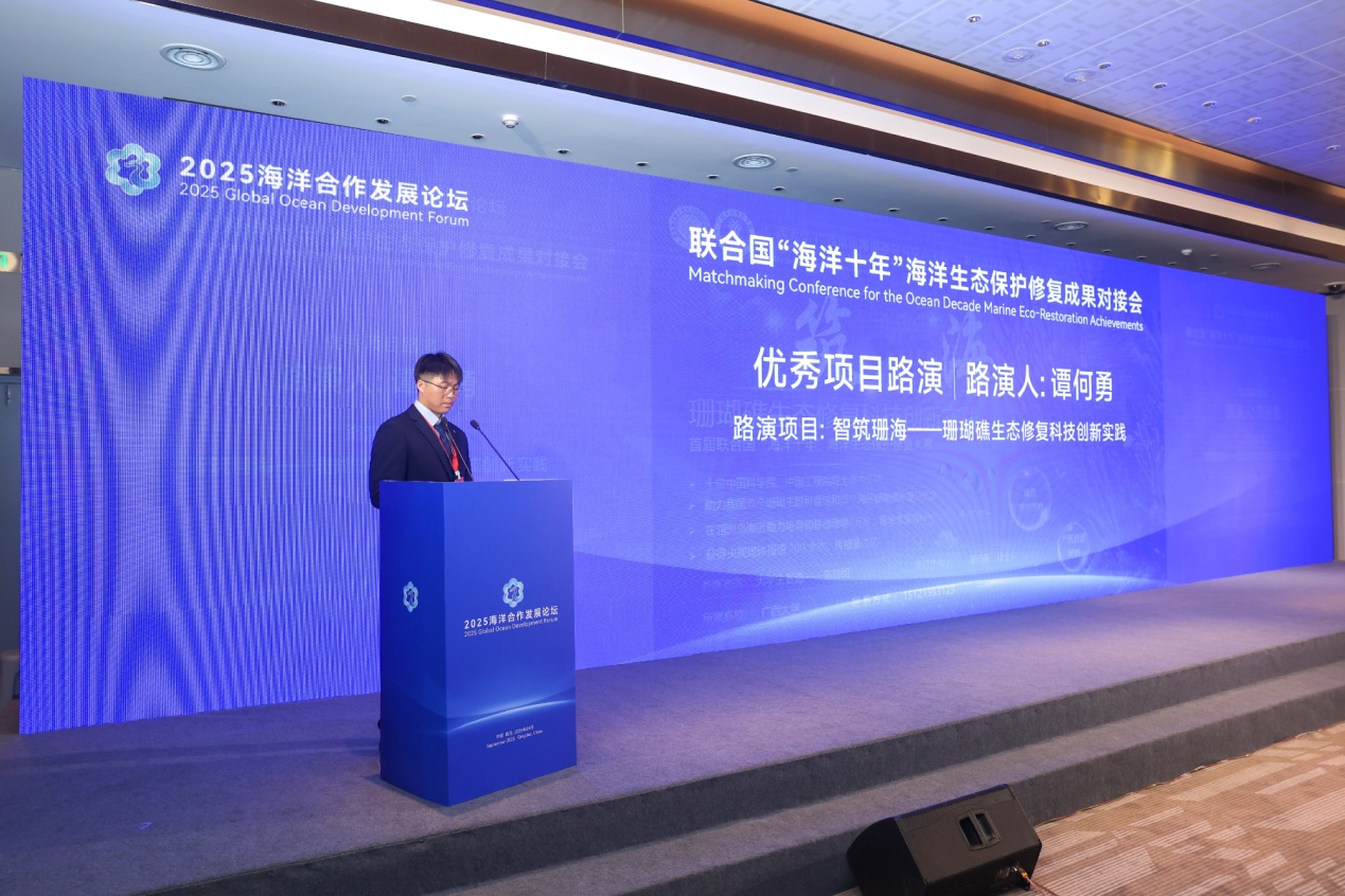 其中,《智筑珊海——珊瑚礁生态修复科技创新实践项目》从众多参赛项目中脱颖而出,作为优胜项目在联合国“海洋十年”海洋生态保护修复成果对接会上进行路演展示。该项目团队14员工组成——涵盖博士、硕士与本科生。为破解珊瑚礁修复难题,团队跨越17个纬度、覆盖269个调研站位,通过太平洋、印度洋多航次实地考察,精准锁定技术痛点,历经八年攻坚、32项技术尝试、853次实验迭代,最终突破三大核心技术,构建起培育驯化移植监测的全链条解决方案。曾荣2024年中国国际老员工创新大赛国赛银奖和自治区金奖;第九届创客中国广西壮族自治区中小企业创新创业大赛创客组一等奖;以及中国志愿服务项目大赛国赛银奖等。该团队将继续紧跟海洋强国战略,立足广西、面向南海、辐射东盟:深化人工修复+自然恢复协同模式,推动蓝碳经济发展;将技术推广至一带一路沿线沿海国家,用中国智慧助力全球珊瑚礁保护。