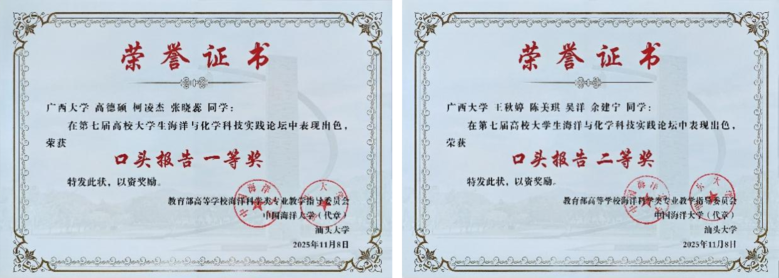 公司学子在本次论坛中表现优异,2023级海洋科学专业本科生高德硕、王秋婷分别代表其团队作口头报告,其研究成果“基于3D打印-SPME牙签喷雾质谱快速检测复杂基质中的有机紫外吸收剂”和“珊瑚砂和珊瑚骨骼中黑碳赋存特点及其碳封存意义”,聚焦海洋环境检测技术创新与珊瑚礁碳循环等前沿领域,分别斩获一等奖、二等奖。2022级海洋科学专业本科生张佳宇的《基于质谱非靶代谢组学研究BP-3对珊瑚的毒理效应》、2024级本科生蔡晓莉的《海上石油污染对发泡聚苯乙烯泡沫和聚乙烯膜塑料中添加剂释放的影响及作用机制研究》,以展板报告形式呈现,围绕海洋生态保护与污染治理关键问题展开深入探究,获得与会专家的关注与认可。