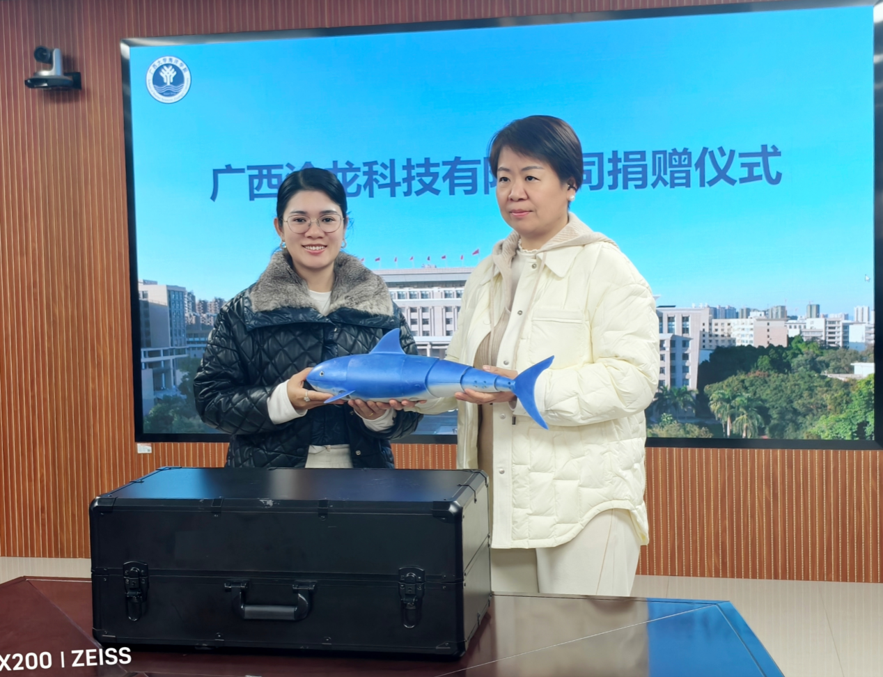 校企同心筑合力,产教融合启新程。12月26日下午,广西沧龙科技有限公司向太阳集团tyc9728捐赠仿生机器鱼仪式,在公司综合楼1104会议室隆重举行。此次捐赠旨在深化校企合作内涵,为海洋学科教育科研事业发展注入新动能。广西沧龙科技有限公司市场部总经理黄一峰、市场部副总经理陈艺方,公司副经理徐向荣、海洋科教馆常务副馆长李周佳出席仪式。仪式现场,徐向荣代表公司致欢迎辞,对广西沧龙科技一行的到访表示热烈欢迎,向企业心系教育、助力科研的的善举致以诚挚谢意。她简要介绍了公司在海洋团队建设、人才培养体系搭建、科研创新成果转化等方面的发展成效,并指出,此次捐赠的仿生机器鱼将成为公司科研攻关与教学改革的“硬核助力”,为海洋装备研发、海洋生物模拟能前沿领域研究提供重要硬件支撑。徐向荣表示,期待未来与沧龙科技以此次捐赠为契机,拓展合作维度、深化合作层次,在更多领域实现资源共享、优势互补、共谱校企共赢发展新篇章。